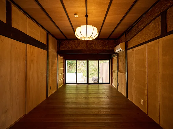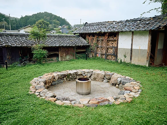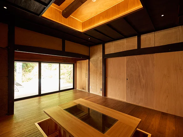 山村風景に溶け込む古民家で、伝統的な建築様式と