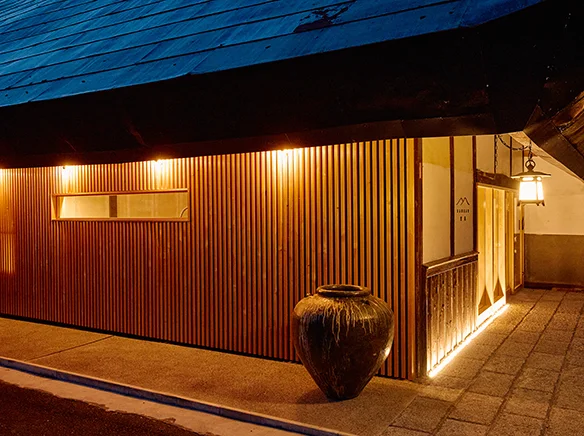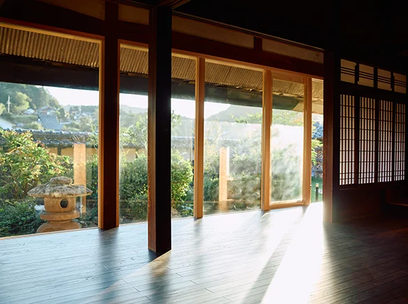 山村風景に溶け込む古民家で、伝統的な建築様式と